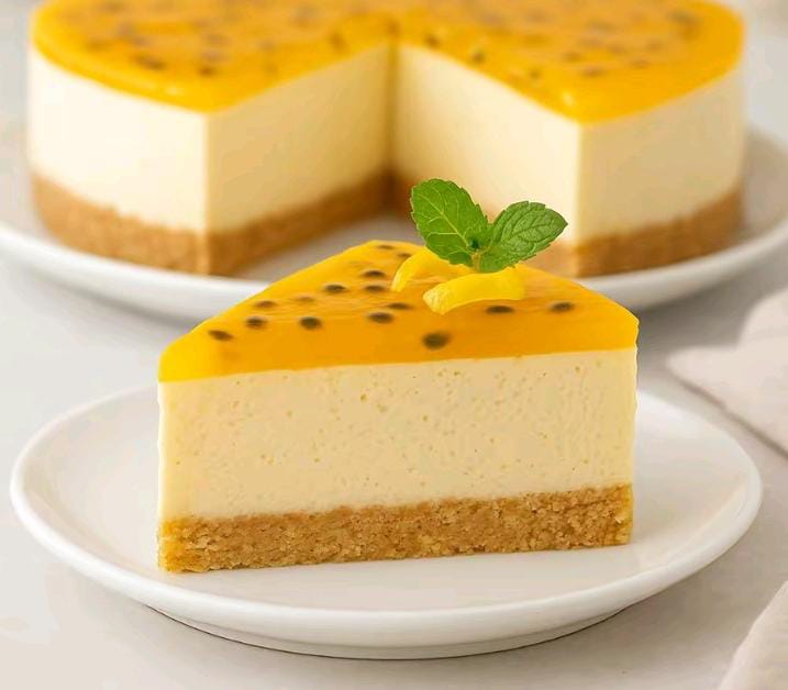 Deléitese con la perfecta armonía del cremoso cheesecake y el exótico maracuyá